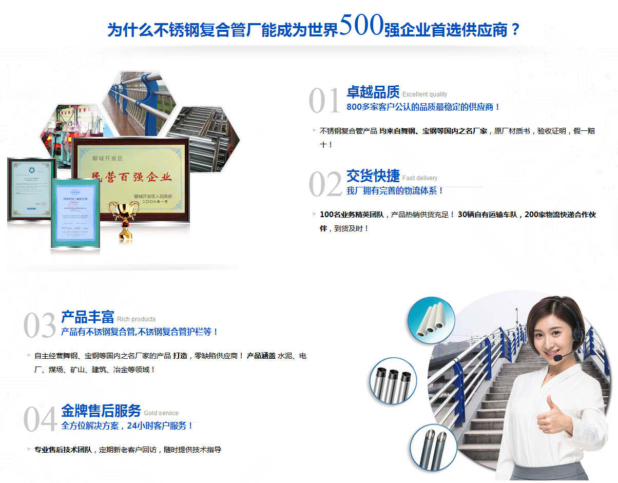 山東鑫旺通金屬制品有限公司座落在管材的生產(chǎn)基地--聊城市。 我公司引進(jìn)國外新技術(shù),專門生產(chǎn)不銹鋼復(fù)合管、不銹鋼復(fù)合管欄桿、不銹鋼/碳素鋼復(fù)合圓管、方管、橢圓管、橋梁護(hù)欄、景觀護(hù)欄等系列新型材料的企業(yè)。公司占地6萬余平方米,設(shè)有生產(chǎn)基地、銷售公司、研發(fā)中心等機(jī)構(gòu),是一家集科、工、貿(mào)為一體的高新企業(yè)。公司外復(fù)不銹鋼復(fù)合管車間擁有八條自主知識產(chǎn)權(quán)生產(chǎn)線,專業(yè)從事外復(fù)不銹鋼/碳素鋼復(fù)合管生產(chǎn)及工程設(shè)計(jì)、制作、安裝、施工。先進(jìn)的生產(chǎn)工藝和嚴(yán)格的檢測手段,使企業(yè)產(chǎn)品全部通過不銹鋼復(fù)合管國家標(biāo)準(zhǔn)(GB/T18704-2008)。